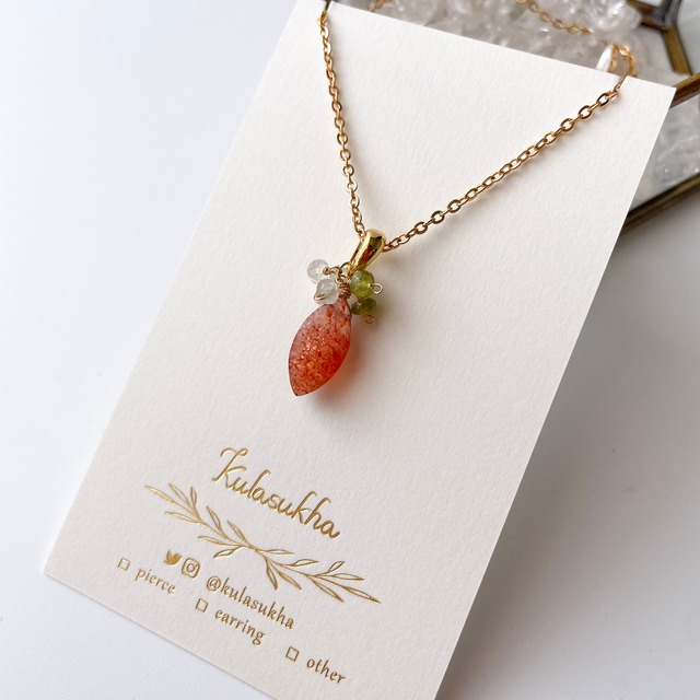 ラグビーボールのような形が可愛らしいサンストーンをメインにしたネックレスです。 サンストーンの発色がとても良いですし、グリッター感ある内包物がちゃんと見られてギラギラと輝きます。 ヌーディなオレンジカラーなので、素肌に馴染んでくれます。目立ちすぎなくてとても使いやすいネックレスです。 上部にはアイドクレースと、セイロンムーンストーンの小粒を散りばめて華やかにデザインしました。 色合い・デザイン的に、こちらのピアス(イヤリング)とのセット使いもおすすめです。 https://kulasukha.theshop.jp/items/114293474 <天然石:サンストーンについて> 和名は「灰曹長石(かいそうちょうせき)」。鉱物名は「フェルスパー」 サンストーンはムーンストーンやラブラドライトと同じ長石のグループに属する石。 石の中にラメを散りばめたようなキラキラとした輝きが特徴的で、 同じ長石グループに属するムーンストーンの、月光のような光と対照的な太陽のような輝きを放つことからサンストーンと呼称されるようになったと言われています。 また、ギリシャ語で太陽の石を意味するヘリオライトという別名も持っています。 【使用素材】 天然石:サンストーン・アイドクレース・セイロンムーンストーン チェーン:16kgp ワイヤー:14kgfワイヤー 【size】トップ部分のみ 縦:2.5cm 横:0.7cm アジャスターは有料でお付けできます。 オプションでご選択くださいませ。 【お取り扱いについて】 本商品は着け心地の良さを考え、非常に軽く作られております。 繊細なパーツを使用していますので強く引っ張ったりなさいませんようご注意ください。 当店の天然石はAAA~AAとして販売されている石を使用しておりますが、天然素材のため内包物や、ヒビ・欠けなどが見受けられる場合がございます。大きさ・色の濃淡も1粒ずつ異なりますが天然石の魅力としてご理解をお願いいたします。 【金属アレルギー対応について】 ◆ゴールドのパーツは16KGPを使用しています。 ◆ゴールドワイヤーは14KGFを使用しています。真鍮に14金のゴールドを圧着したものでメッキよりも剥がれにくくアレルギーの心配が少ない素材です。 ◆シルバーパーツはサージカルステンレス、またはシルバーフィルド(Silver Filled)を使用しています。Silverフィルドとは真鍮にシルバー925を圧着したものでメッキよりも剥がれにくく丈夫な素材です。 すべての方に金属アレルギー反応が出来ないこと(アレルギーフリー)を保証するものではございません。皮膚に異常を感じた場合は直ちにご使用を中止し、専門医にご相談ください。 【化学物質過敏症の方へ】 当店のアクセサリー・雑貨は全て匂い移りの対策を取っています。 制作者本人が合成香料に反応してしまうため、無香料の作業空間で制作しています。 輸送中の移香を防ぐため、ご希望の方はチャック付きの袋に商品をお入れしますのでお知らせください。 なるべくの対策を講じておりますがマイクロプラスチックを含む香料などは目に見えるものではないため、完璧を保証するものではございません。ご了承くださいませ。