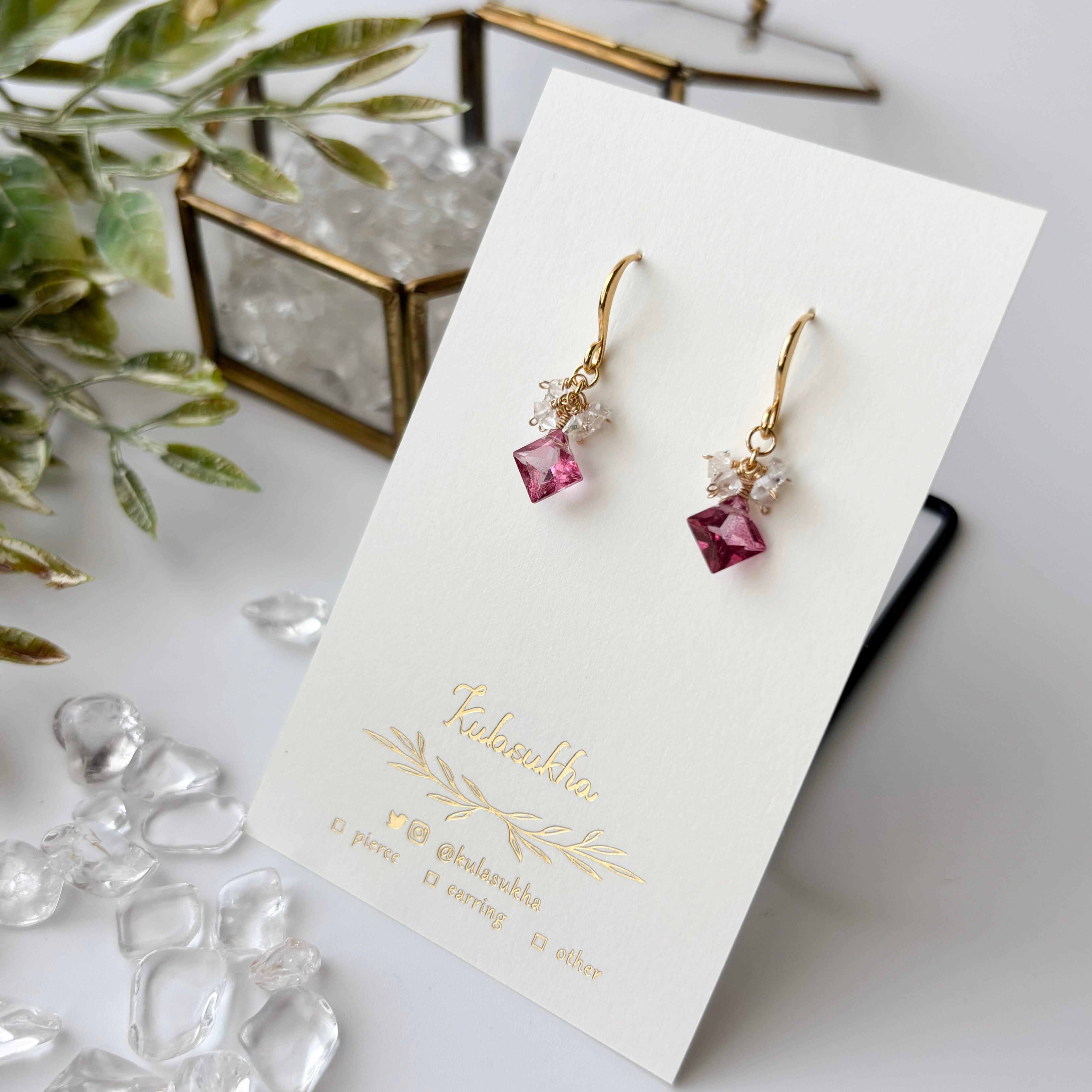 ピンクトパーズ・プリンセスカットの小粒ピアス