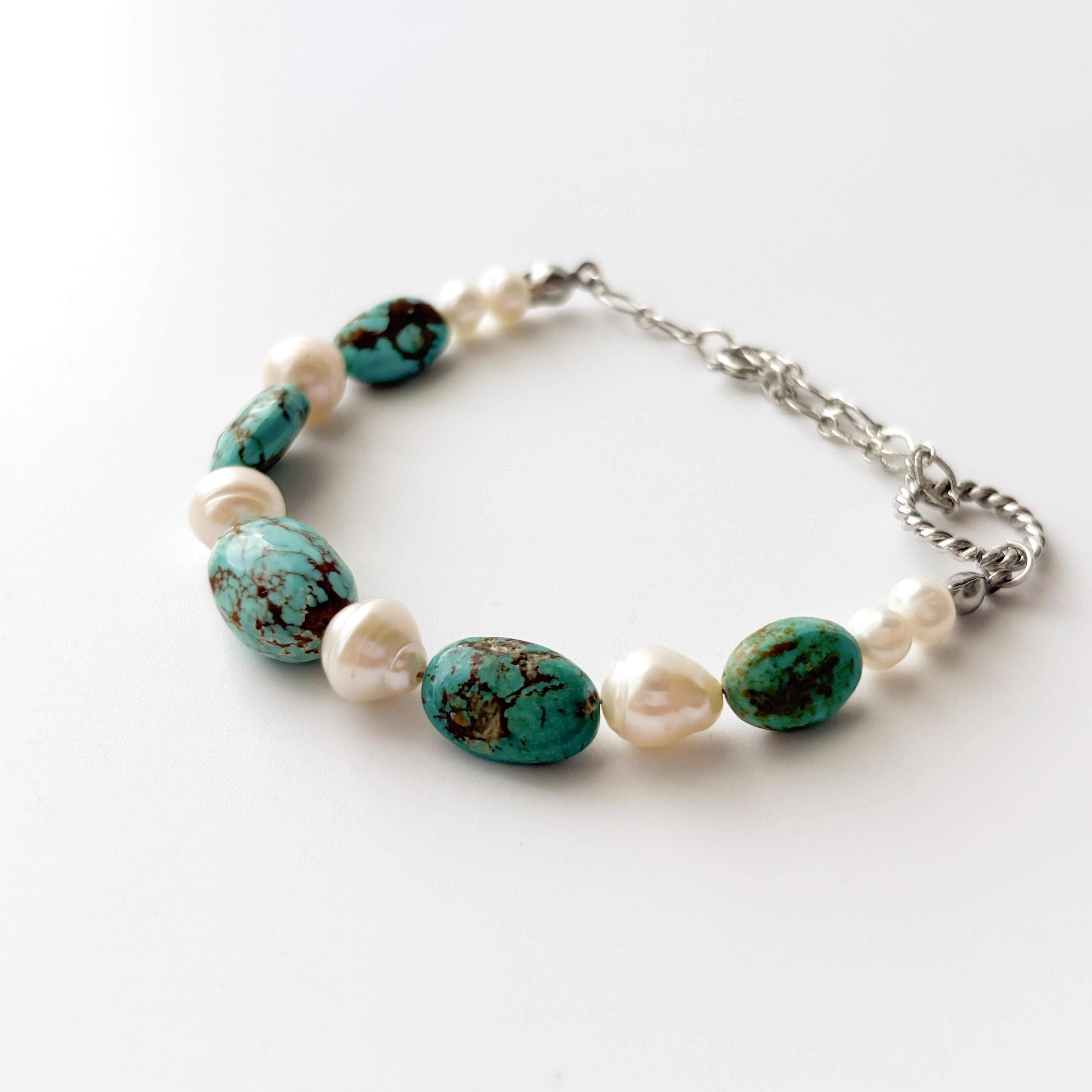 大粒キングマンターコイズと淡水パールのシームレスアジャスター付きブレスレット