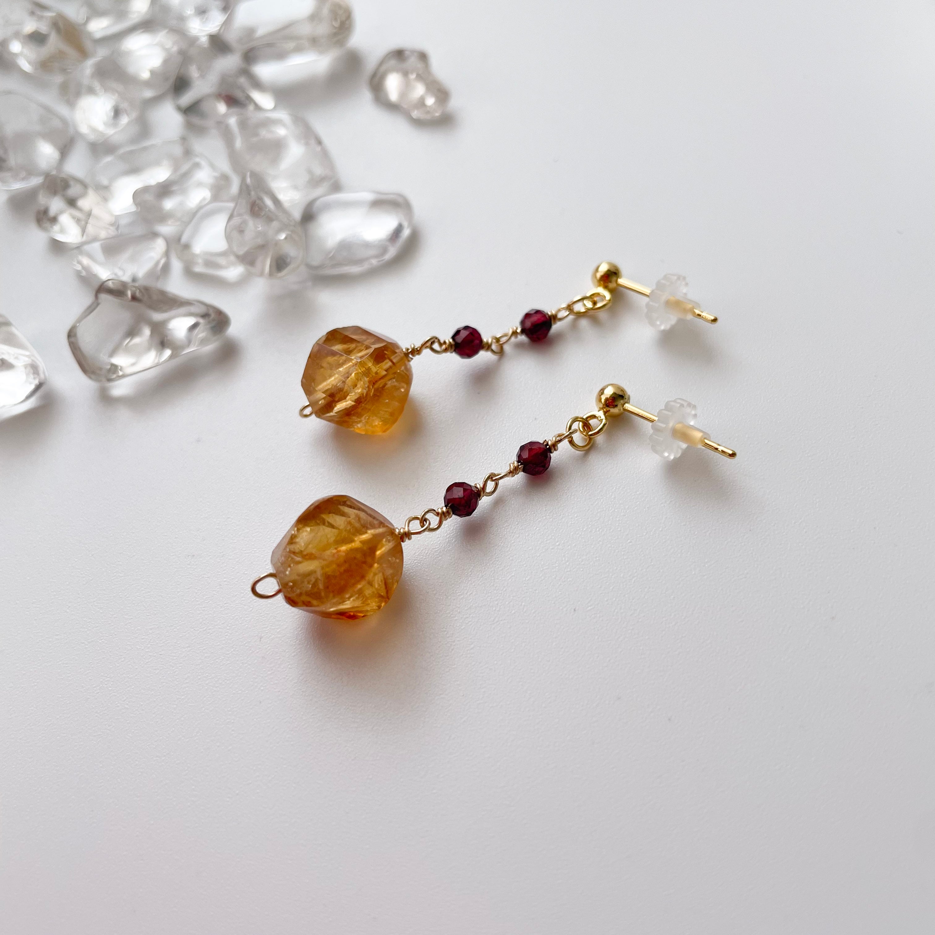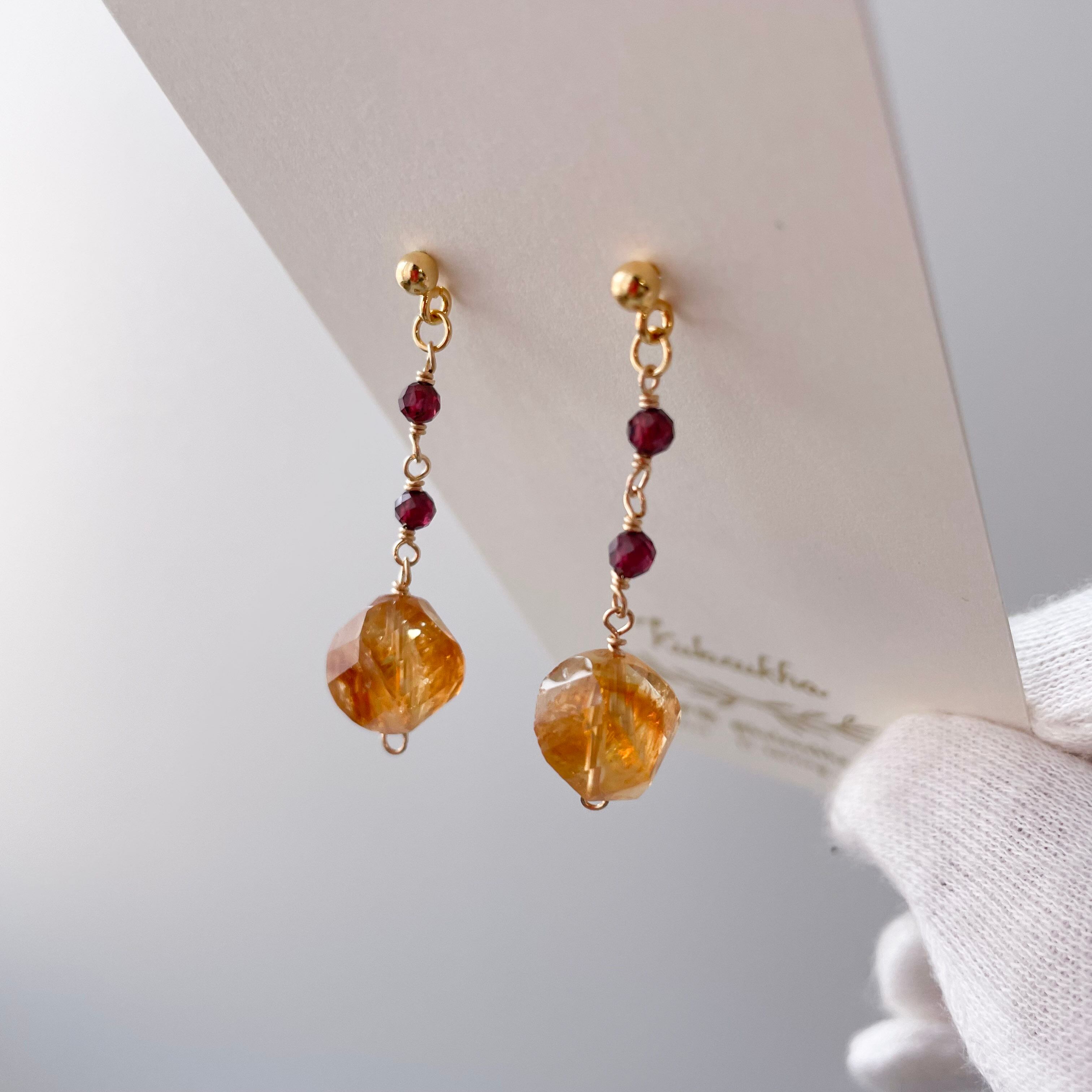 べっこう飴のような艶感が可愛らしいファントムシトリンに、熟した果実のような濃い色のモザンビークガーネットを合わせた、大人っぽいしっとりとしたカラーのピアスです。