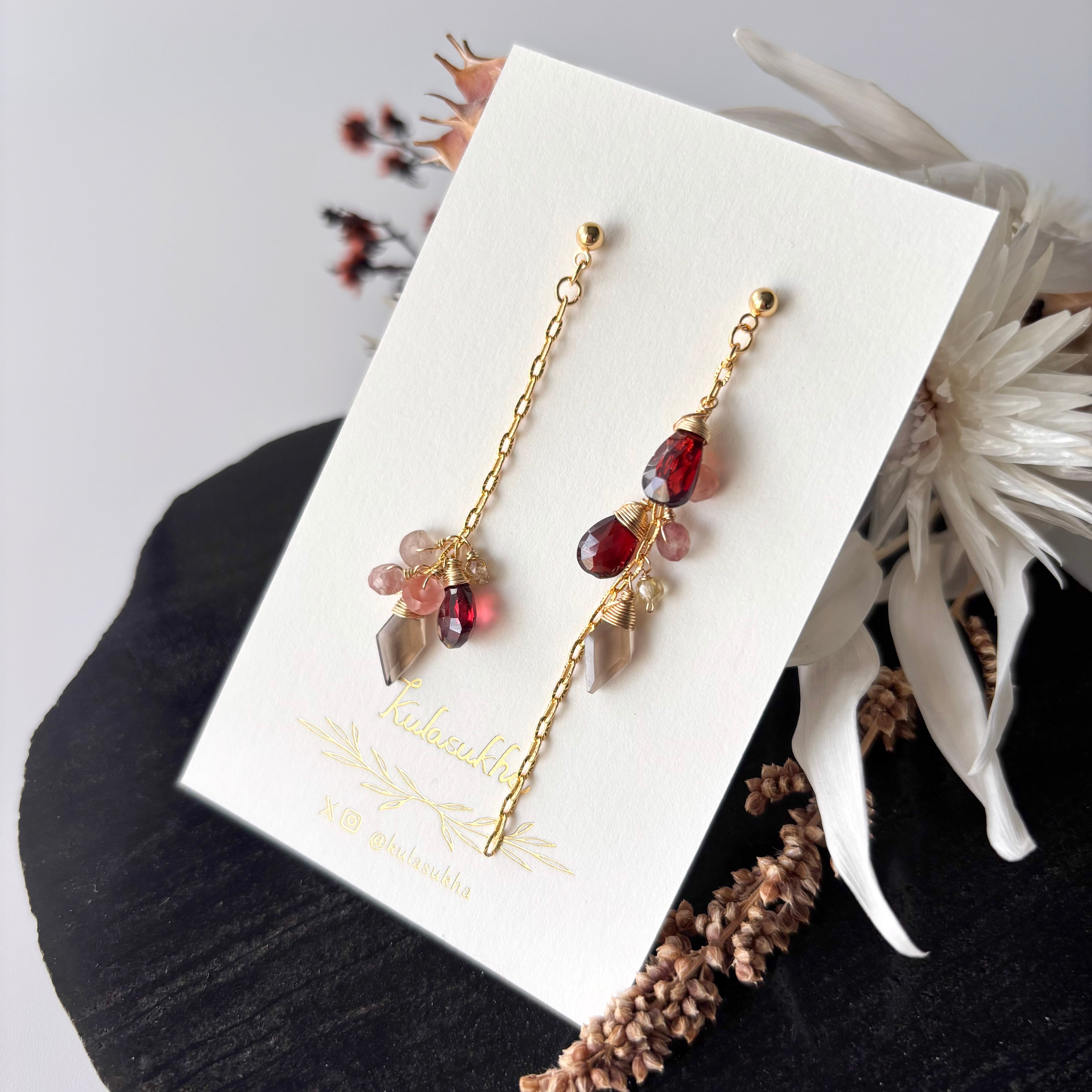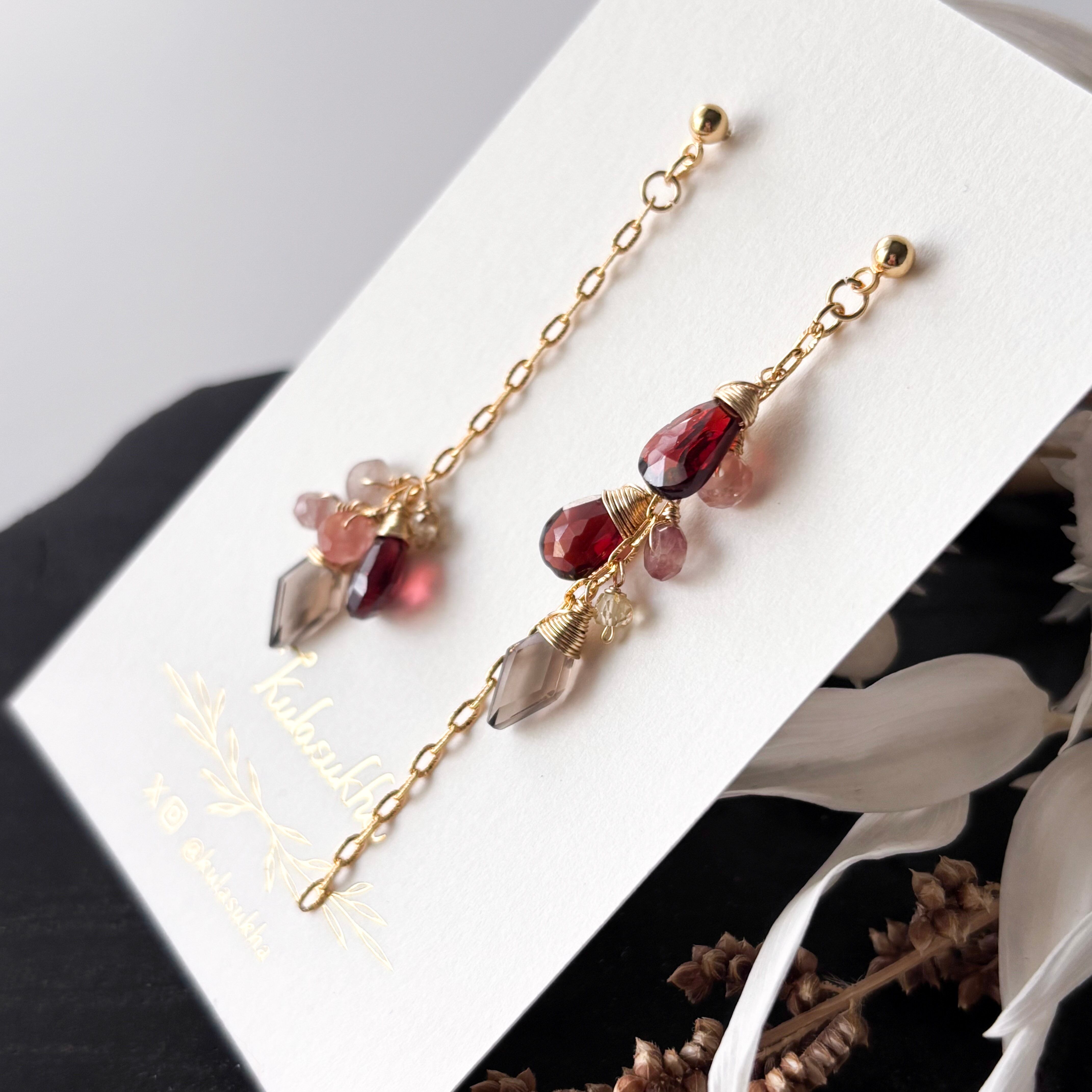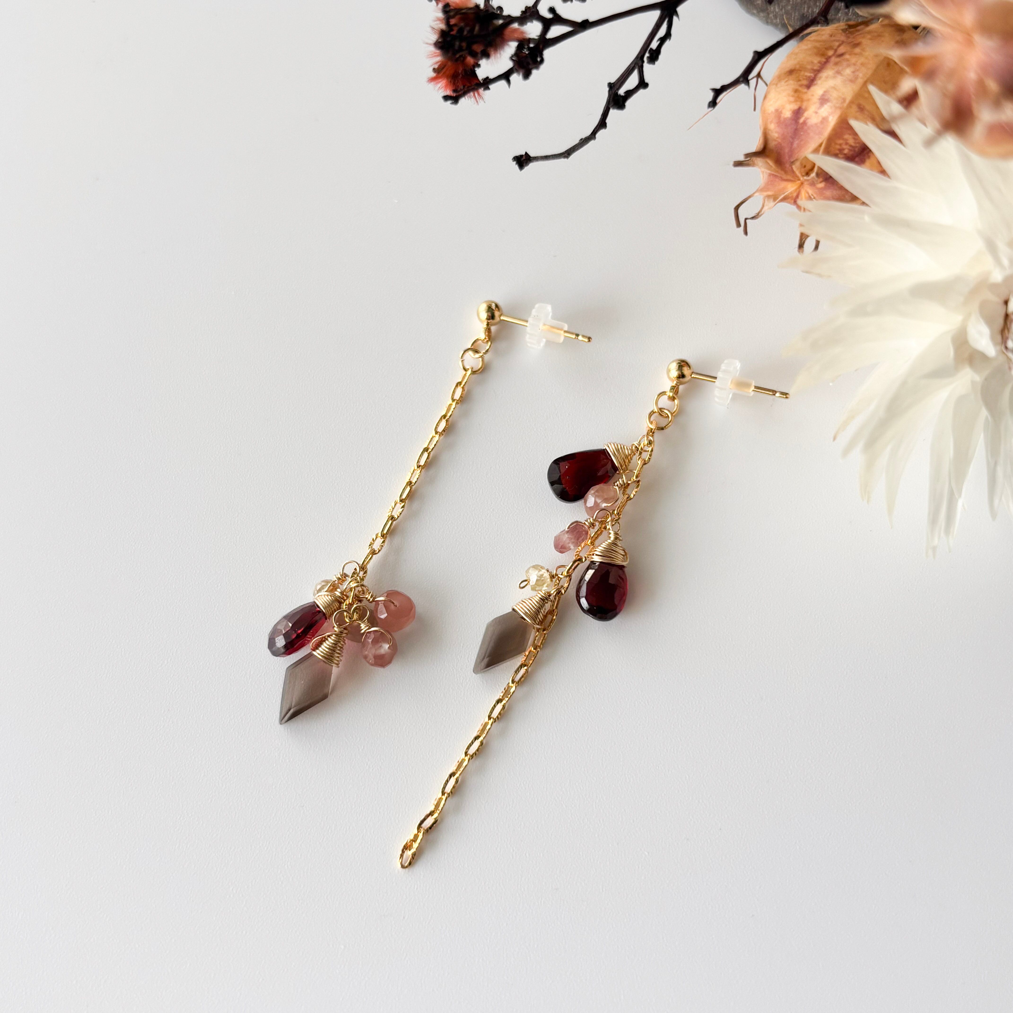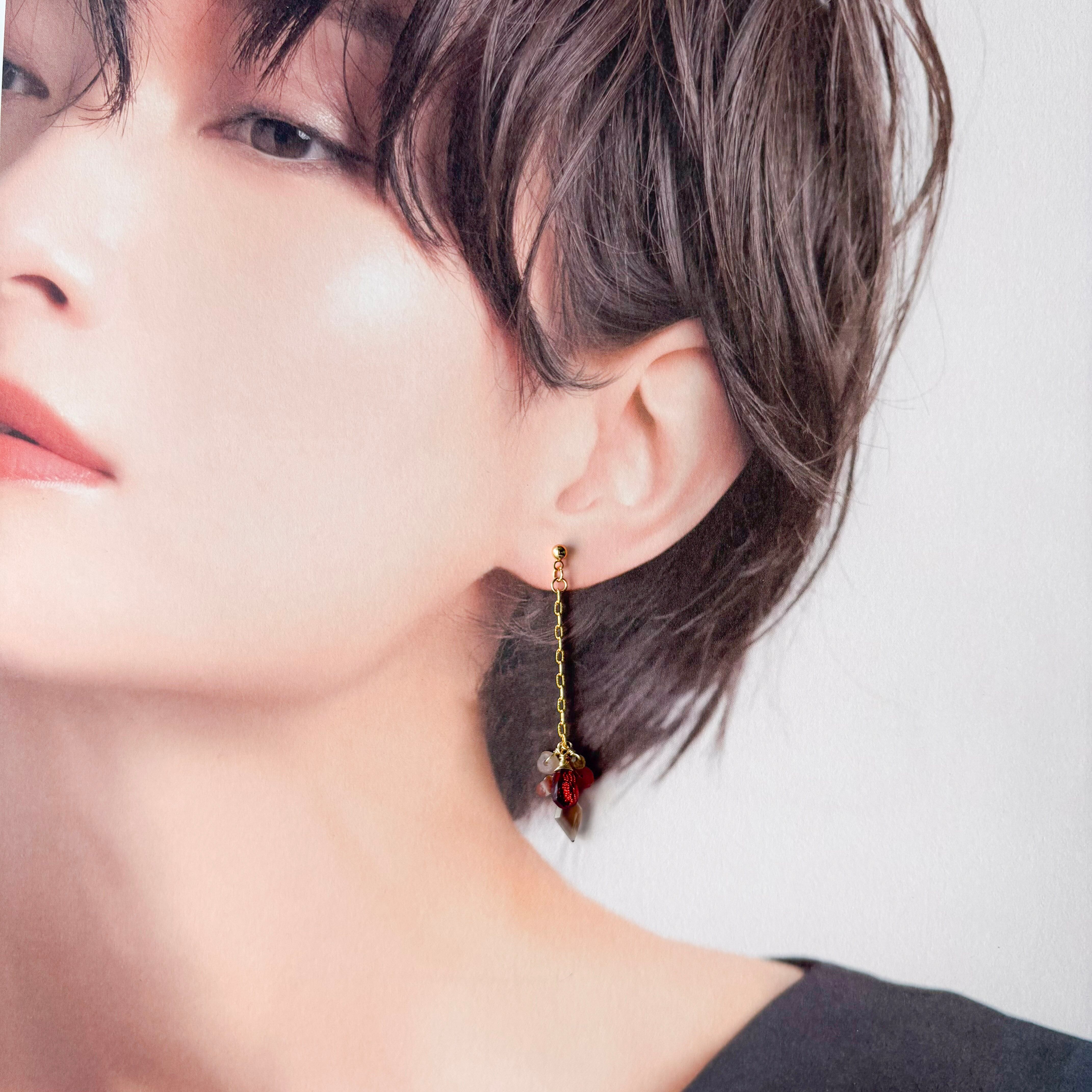 モザンビークガーネットの赤色が映える大人っぽいアシンメトリーピアスです。