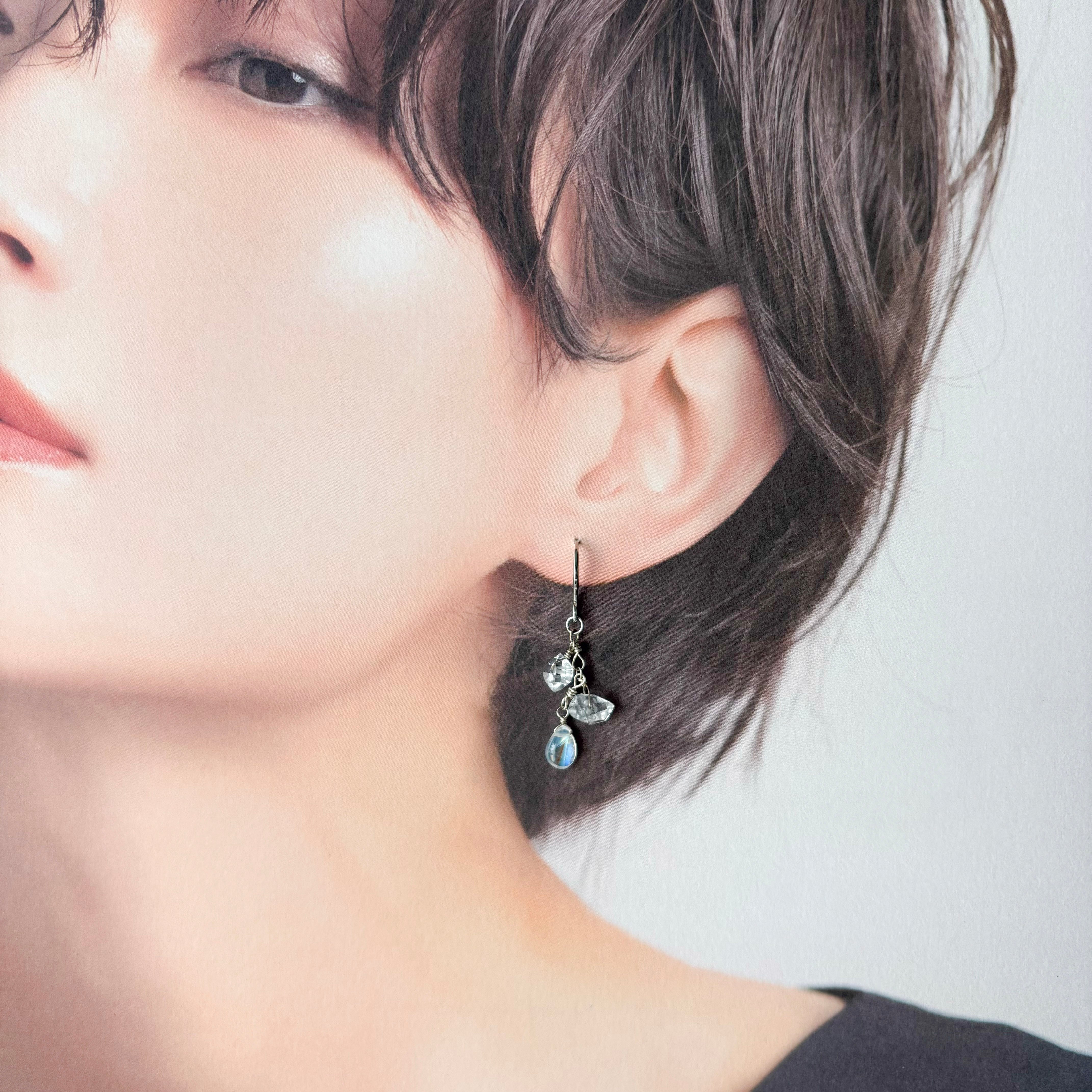 一番下には雫型のレインボームーンストーンを1粒繋げており、シャープなハーキマーダイヤモンドに丸みのあるレインボームーンストーンを合わせることで、クールになり過ぎず程よい甘さを感じます。