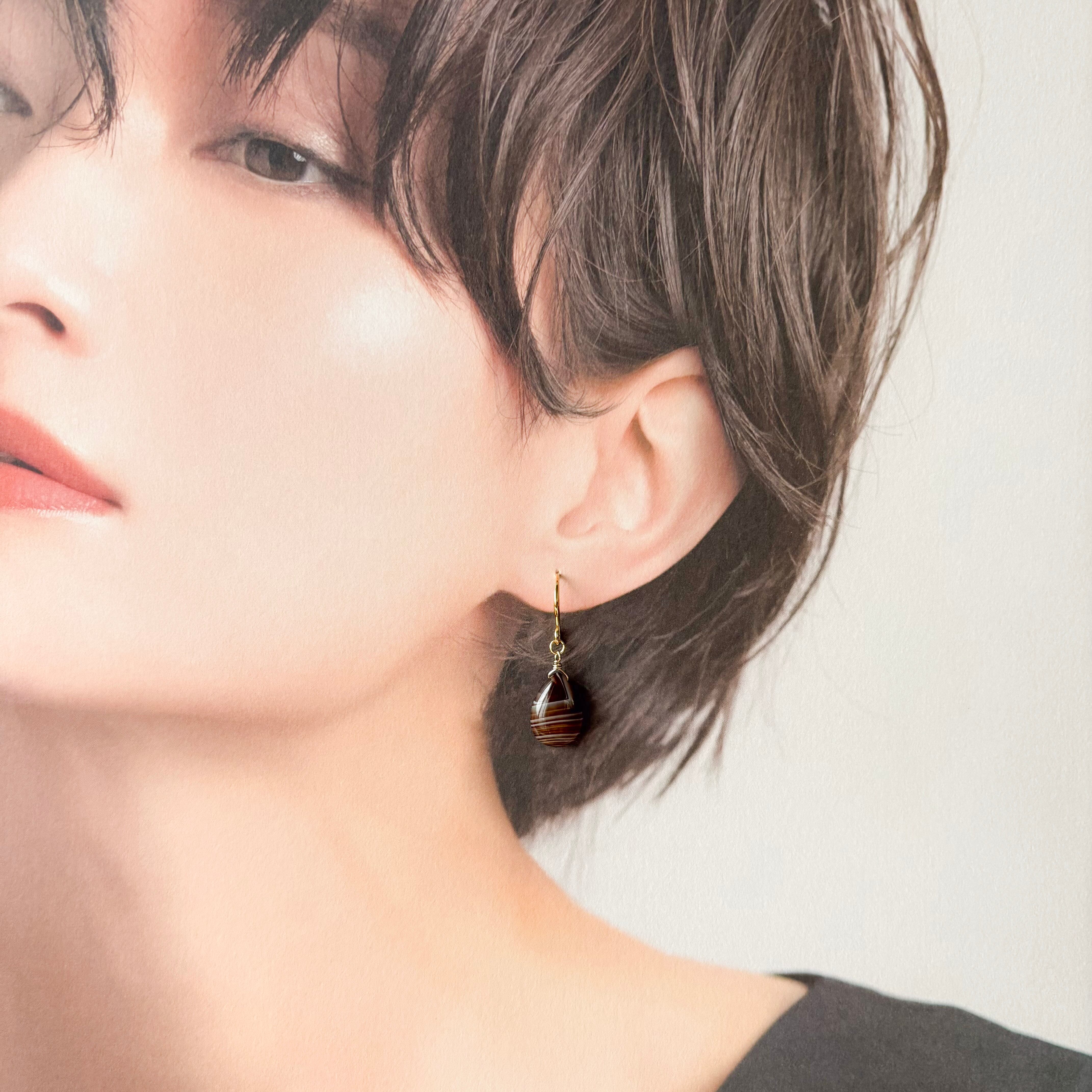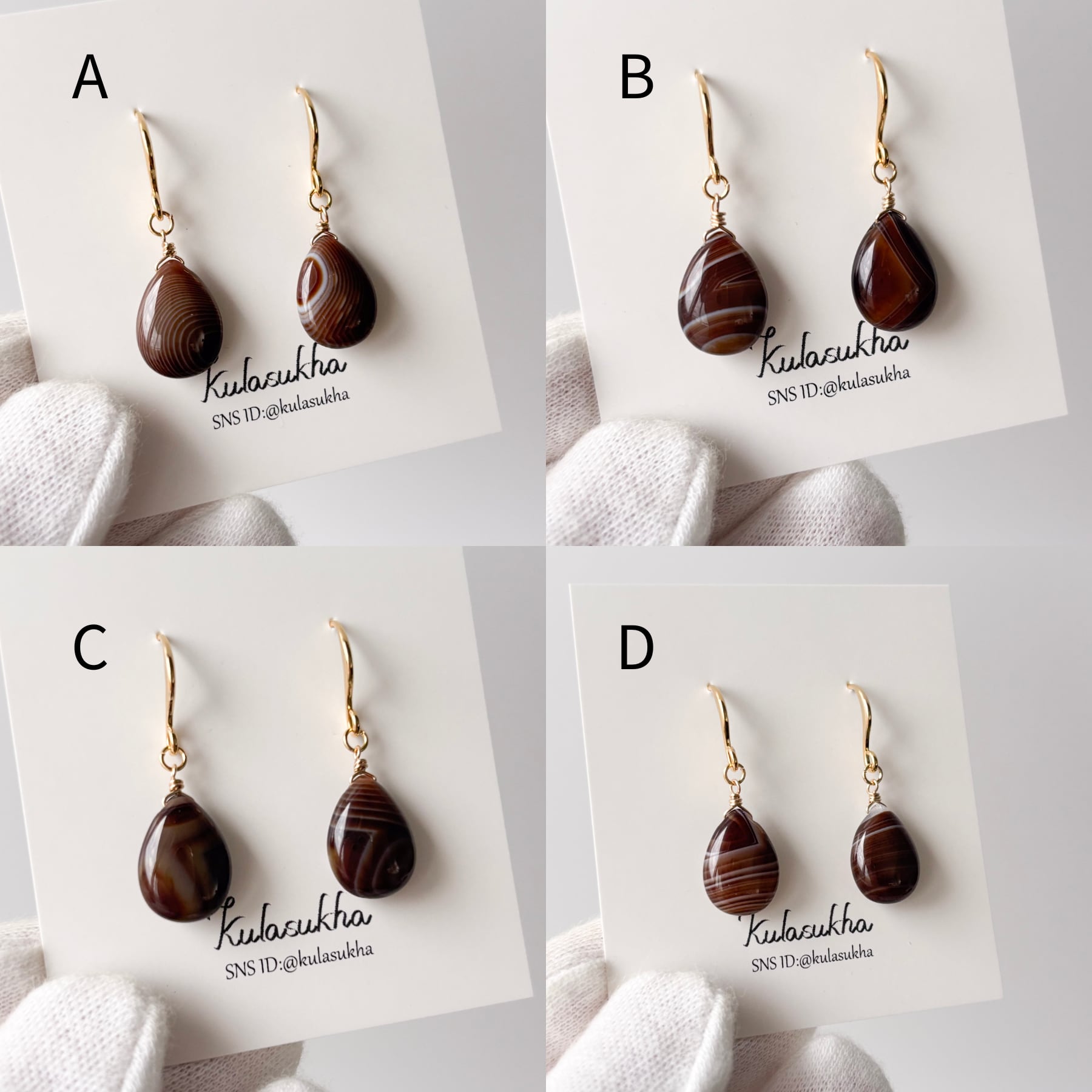 珈琲カラーな縞々ブラウンストライプアゲートの1粒ピアス【4種】